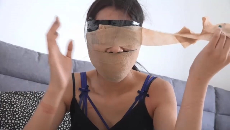 片段4:经过剧烈挣扎后,遭遇入室抢劫的李然与王蕾姐妹二人终于弄松捆绳,解除封眼绷带后,王蕾撕掉封嘴绷带与胶带,拽出口中男劫匪穿过的一双深灰色锦纶丝袜,厌恶地丢掉喘息着,而后帮表姐李然解除封嘴绷带与胶带,李然拽出口中王蕾腿上的原味肉色连裤丝袜丢掉了。姐妹二人发誓要抓住可恶的劫匪。