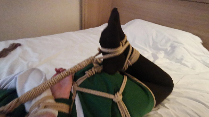 脱掉靴子趴在床上紧紧的捆绑成驷马,嘴里塞进丝袜,并用丝袜套住头蒙住眼睛。骗她有事出去下,小冷以为我真的出去了,房间就剩下被绑成粽子的自己,开始慌了,开始挣扎,并叨咕着什么(被堵着嘴,也不知道这丫头说的啥)。