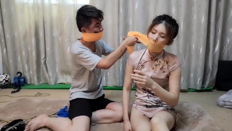 (二)被劫持驷马捆堵的冷兮及其男友经过长时间挣扎,最终冷兮率先挣脱捆绑将男友解放,二人互相帮对方撕掉封嘴自粘绷带胶带还有电工胶布,拽出口中塞嘴丝巾大口喘气。