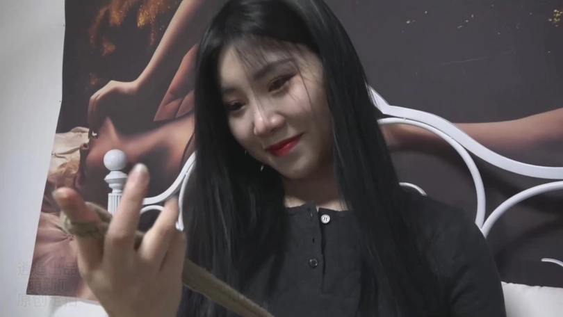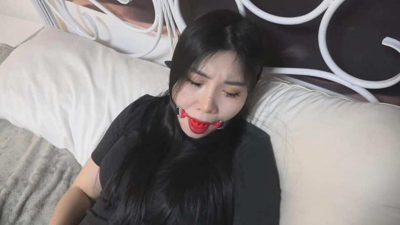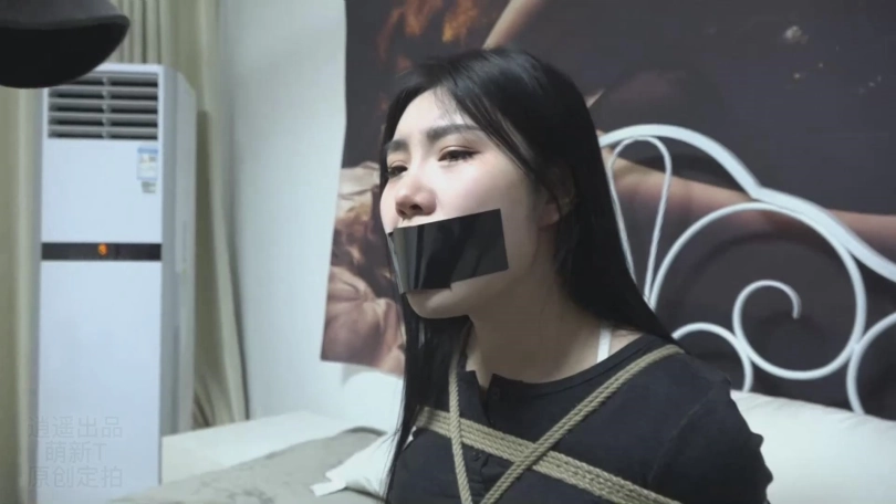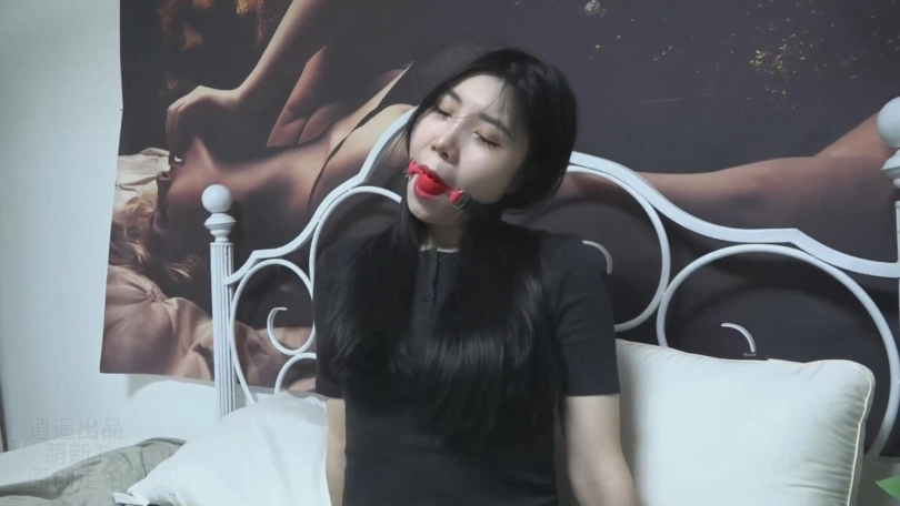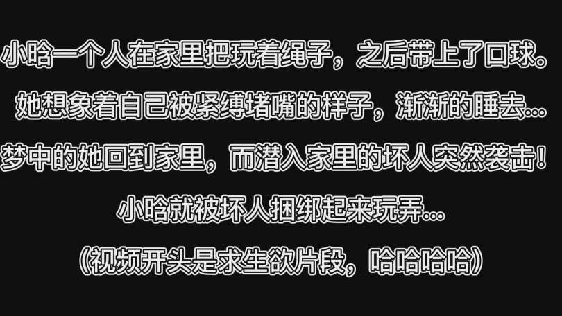 小晗一个人在家里把玩着绳子,之后带上了口球。