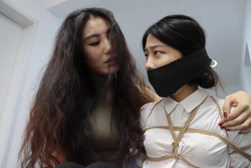 两人用胶带封住米娅的眼睛又缠了两圈绷带,米娅用尽力气想躲可还是徒劳无功。