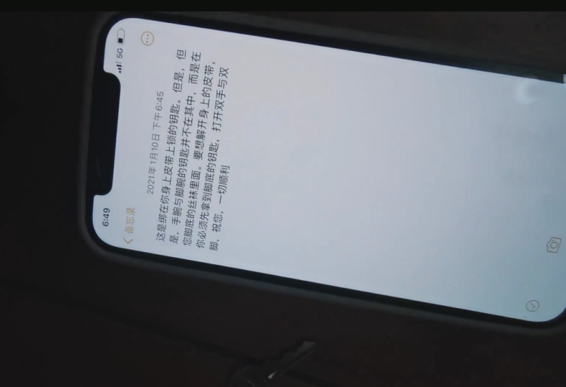 第三幕:小丁不断的挣扎,皮带越来越紧。丝毫没有松动的痕迹,小丁正开始绝望的时候,发现地上不远处,手机亮起来了。手机旁边还有一把钥匙。顿时,小丁心里燃起了希望。小丁开始艰难的往手机的方向挪动过去。手机上出现一串字(这是绑在你身上皮带上锁的钥匙。但是,但是,手腕与脚腕的钥匙并不在其中,而是在您脚底的丝袜里面。要想解开身上的皮带,你必须先拿到脚底的钥匙,打开双手与双脚,祝您,一切顺利)。小丁这才感觉到,自己脚底确实有两个硬梆梆的金属物品。