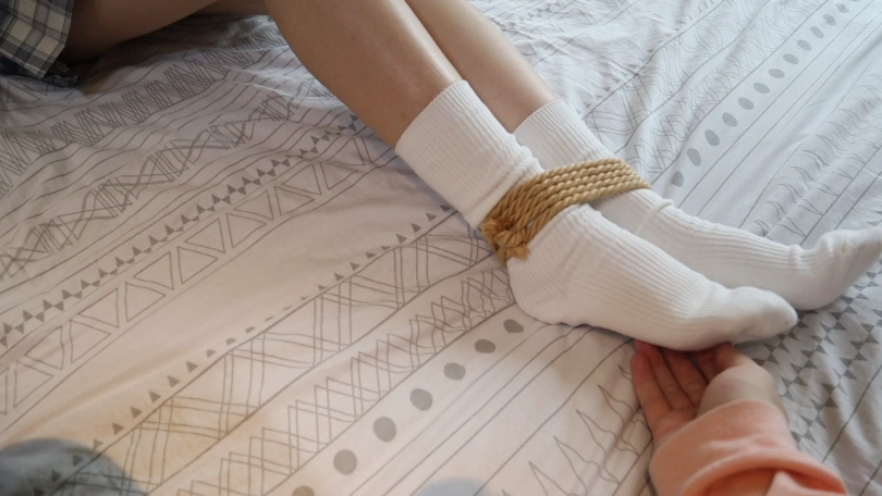 ,慢慢挣脱绑在卫生间杆子上的绳子之后,慢慢向卧室移动,全身紧紧的绑住,穿着白棉袜的小脚只能缓慢的移动,一步一步,