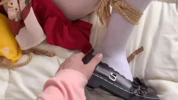 慢慢的脱下小灵的lo鞋 每脱下一只就挠一阵子!! 触碰到白丝小脚的时候就疯狂躲闪。