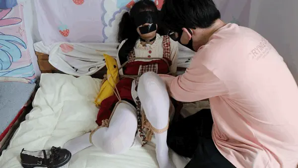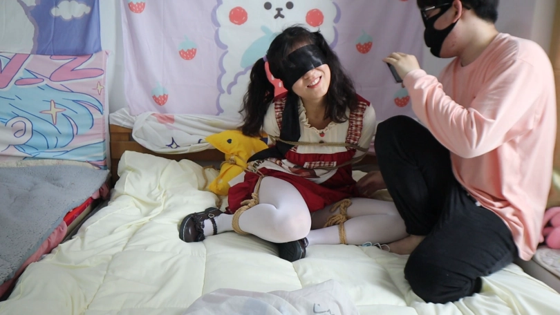 直接日式捆绑,下半身M字绑好,并固定再了床上