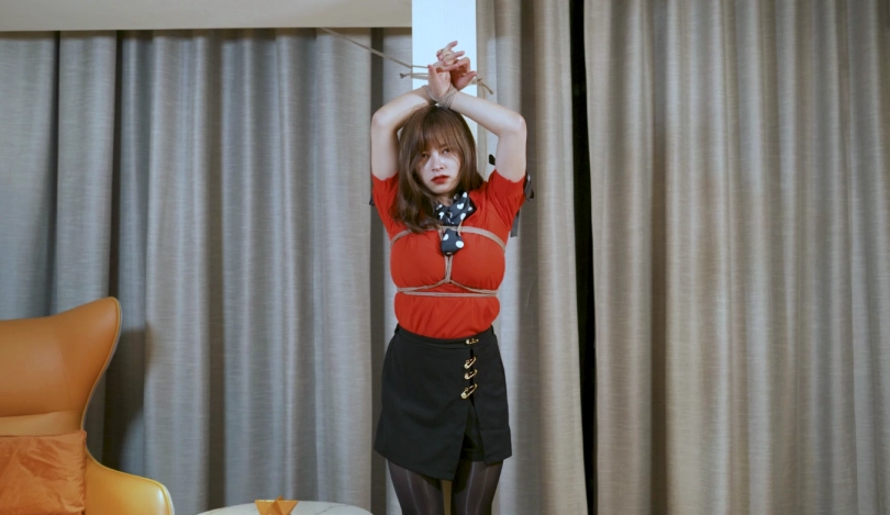 【4K映像】复古红色裙装,丝巾稍加点缀,紧贴柱子。