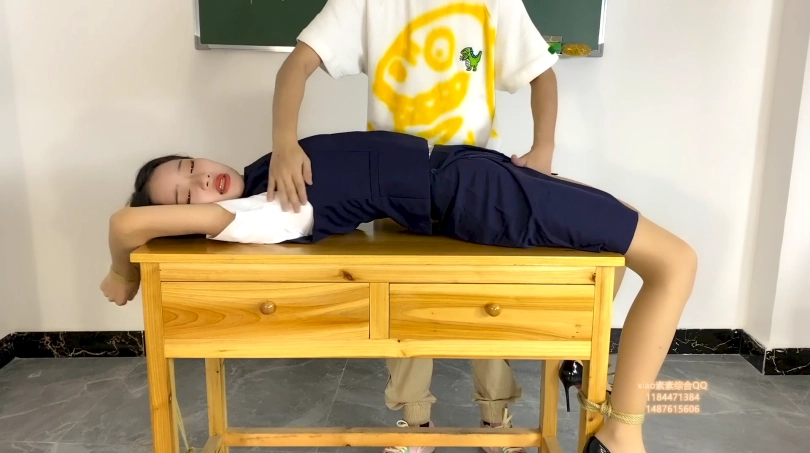 脚也完全固定好,拖了高跟鞋进行tj和 tk 素素求饶也没有用,最后还把素素 绑到四方桌上,进行tj