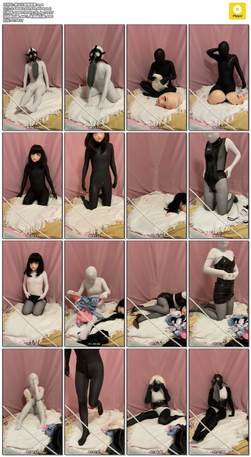 这次是多元素的一场直播录播,其中有kigurumi和多层zentai全包的元素,防毒面具的呼吸袋也让八六小姐姐非常辛苦,直播全程1小时58分钟原声放送,喜欢真实ZENTAI聊天的同好们可以收藏。