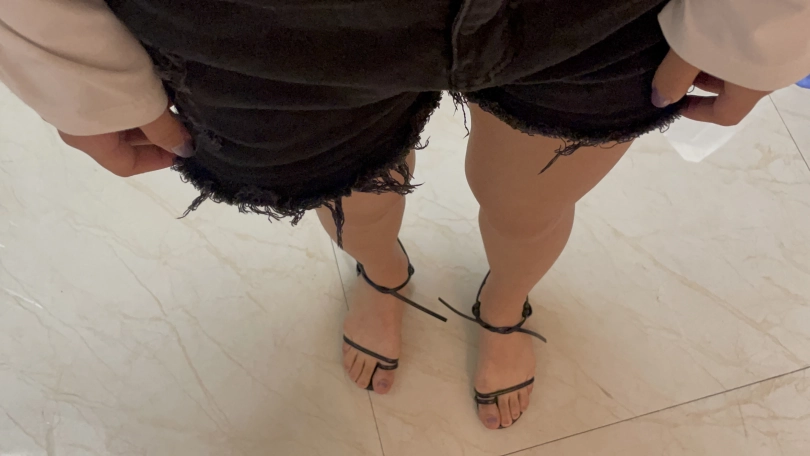 室内,罗菱菱穿着日常的裙子,穿着黑色凉鞋(镜头开始是全身,然后放大,从上往下拍穿着鞋的脚的特写,约两分分钟)。然后小茜拿着短牛仔裤和白色T恤,去房间换上短牛仔裤和T恤,脚上穿着黑色凉鞋出现在镜头面前。(镜头移动。相机倾斜60度这样,拍大腿到脚的下半身部分,就是大腿和脚要同框。再镜头放大,特写穿鞋的脚)。然后坐凳子上,慢慢脱下凉鞋,穿上船袜,穿上运动鞋,戴上手铐和脚镣,来回走动一下。然后坐在凳子下,慢慢脱下一只脚的运动鞋和船袜,穿上凉鞋。再脱下另一只脚的运动鞋和船袜,穿上另一只脚的凉鞋。把手铐打开,双手背在后面,走来走去,拿起手机,玩一下手机(镜头多拍一下模特穿着凉鞋的脚,多拍一下下半身部分)。