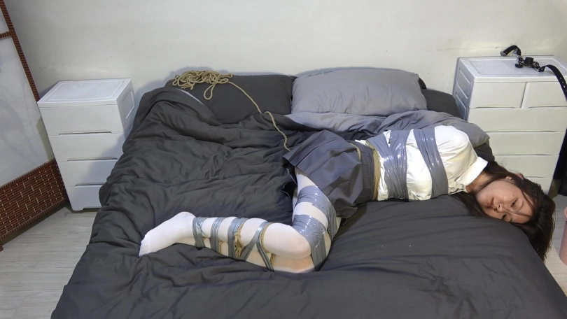 小华家中,小华捆绑女老师(嘴巴粘住),并挠女老师,让女老师自己挣扎。