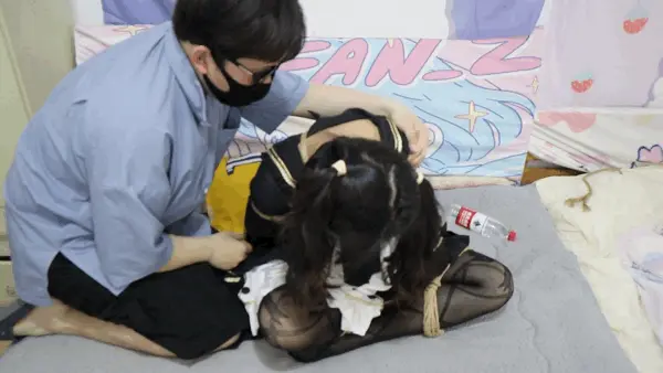 萌妹子浑身颤抖的躲闪,最后还不小心解开了(技术还需加强呀)!
