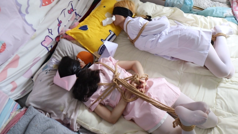 二期直接把两位护士姐姐拥抱着绑在一起,两个女孩子带着脚镣交叉着连缚在一起,手抱在对方身后紧紧的绑着,两女腰上再紧紧的缠着