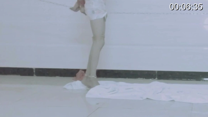 我在拍摄过程中也加了两点难度,为了增加行走的难度我在一段行走距离撒下了豆子,脱掉高跟鞋,穿着丝袜踩在豆子上,让自己行走增加了难度,而绳子也换为了铁链,走绳看过很多,铁链没有吧