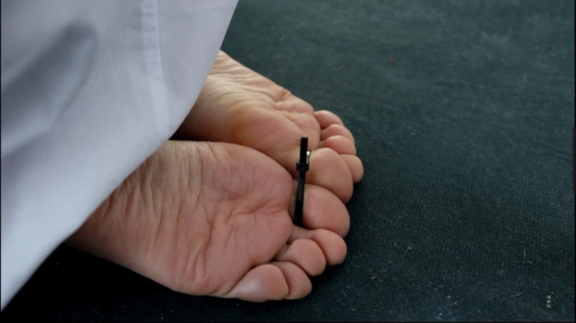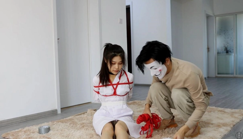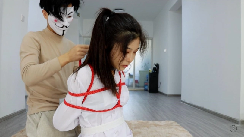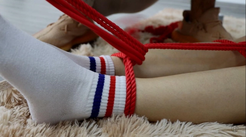 双手攥拳被胶带裹住,双手反剪后被红绳绑在身后,双腿也被并拢绑在一起,一步一步的束缚让米娅体验到了逐渐丧失活动能力的无助感,同时自己还需要配合捆绑,更加令她感到羞耻。