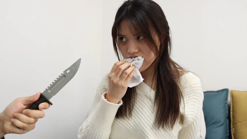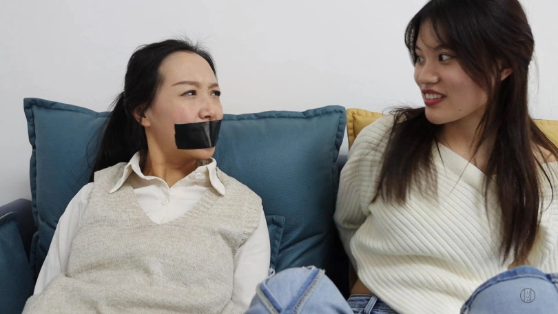 小优与小姨文清姐同住,自从男主一帆和同事们上过一次小优的家吃饭之后,一帆老是接近小优,还嚷着要到访她家。小优不耐烦了,某天假日中午刚刚午饭后,她和小姨诉苦,一帆拿着鲜花、巧古力按她家门铃,小优想打发一帆走,小姨文清却留下他,带他到厨房洗碗盘,同一时间借故要小优到外买抹布。文清姐婉转地告诉他小优对他没兴趣,鼓励他另找对象,一帆想开口,但结结巴巴、欲言又止。文清嘴巴一直不停地说,一帆越想越懊恼,刚好手上洗好一把刀,一时紧张指着文清姐,又搭着她肩膀到大厅,想她坐在沙发听他慢慢说。可是,一帆结结巴巴,文清误会了一帆发疯,举起双手被一帆推到大厅。文清好言相劝,一帆干脆把文清捆绑封嘴,但一帆仍然结结巴巴没把话说清楚。这时小优刚回来,大吃一惊,也被一帆捆绑。