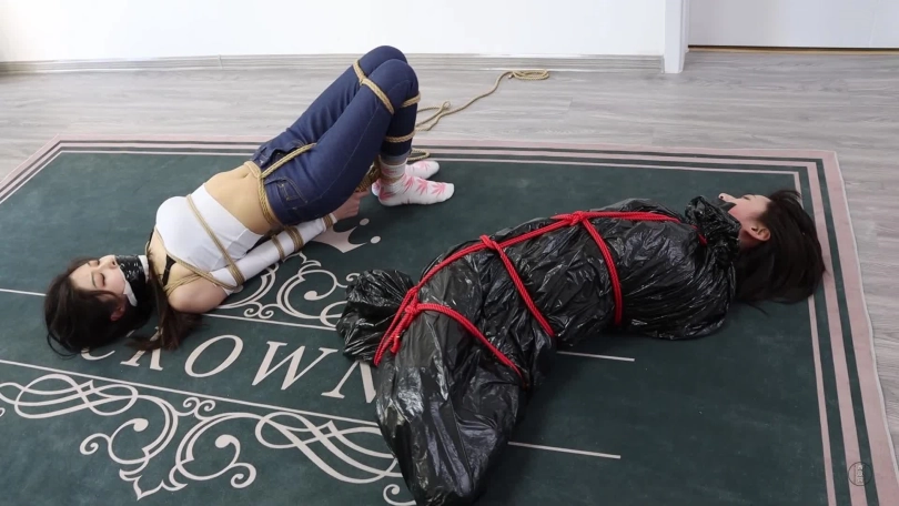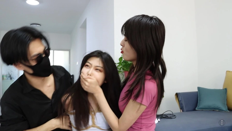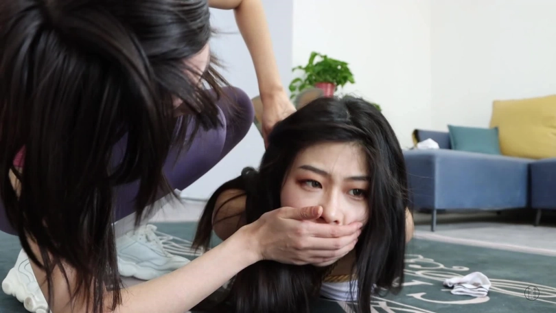主演 原配 米娅饰演。小三 南羽饰演。剧情介绍 这天小三正在男主面前跳绳,一会累了,靠在男主肩膀上撒娇并让男主帮买化妆品,首饰。只见男主微信来了消息,原配说到:渣男昨晚又不回家,是不是跟哪个狐狸精鬼混去了?这话把男主和小三都激怒了,于是两人想把原配骗来,然后整整她。商量完,男主给原配发了定位。原配上当,找上门来,看到坐在沙发上的小三就要打她并破口大骂,二人扭打起来,男主赶忙过来,从背后反剪原配双手并让其跪下,原配仍骂着:渣男,狐狸精,呸。损人的小三决定将自己刚运动完的袜子脱下来堵住原配的嘴。男主捏住原配嘴巴让她张开,小三将一双袜子塞了进去,原配只能拼命发出呜呜呜呜的声音。二人开始用绳子捆绑原配,男主捆绑原配时,小三还不忘拨弄原配头发并嘲讽她。一会,原配努力吐出嘴里的臭袜子,大喊救命,就被小三死死捂住嘴巴又只能呜呜呜呜了,接着二人将她捆绑成直臂紧缚加驷马倒攒蹄,随后为防止她叫喊,小三用昨晚跟男主啪啪的内裤塞到原配嘴里,接着用白色绷带缠绕封嘴,又用黑色胶带缠绕几圈,把嘴彻底堵严实了,任凭原配用力喊叫也只剩下呜呜呜声音,捆绑堵嘴完毕,二人拿来皮鞭和毛刷,抽打原配胸,大腿,脚心,用毛刷挠她全身,再翻个身,摸她的胸拉股绳。过段时间,男主去上厕所,在厕所知道了小三背地里跟好几个男人有一腿,气氛得拿来红色绳子,摁倒小三并将她捆绑起来(也是驷马倒攒蹄加直臂缚),接着用毛巾塞她,外面用黑色超黏胶带封上,捆绑堵嘴好小三后,用一根绳子连接二人膝盖,让二人互相制约,接着在小三面前放一万元钱,在原配面前放一碗水,让她在地上爬,看谁先接触到眼前的东西,谁爬慢了,还遭到男主的鞭子伺候。二人剧烈挣扎并呜呜呜呜(这段挣扎及其真实喜欢的朋友不要错过。)一会,原配含糊不清说到:我碰到了。但男主并不打算放了她,只是把她仰面朝天的放置,至于小三就没那么好了,被装入大号黑色麻袋里包裹包装好,外面再用红色绳子捆绑上,让其动弹不得,只能呜呜呜。处理好二人后,男主表示去睡个觉,留二女在地上挣扎扭动并呜呜呜呜。(最后挣扎扭动不少于3分钟)