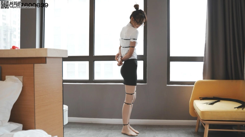 很紧的拘束,虽然简单,但是绝对挣脱不开。胶布封嘴和鼻夹同时用,控制呼吸很有效果。