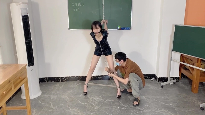 可可老师的身体柔韧性极高被学生反手带上手铐吊挂,双脚张开戴上脚镣,嘴里塞入嘴环,身体前倾头无法抬起,身体弯成90度,口水不停的从可可老师的嘴里流出,学生无比的可恶,用震动机攻击老师的身体,可可老师从来没有感受过这样攻击,老师身体太敏感了不停地大声呼叫,但就是听清她在说什么,身体想躲避,但是逃不开学生的攻击。如此肤白貌美的老师,被学生这样的玩弄。真是又气又兴奋。对着屏幕就是一发。
