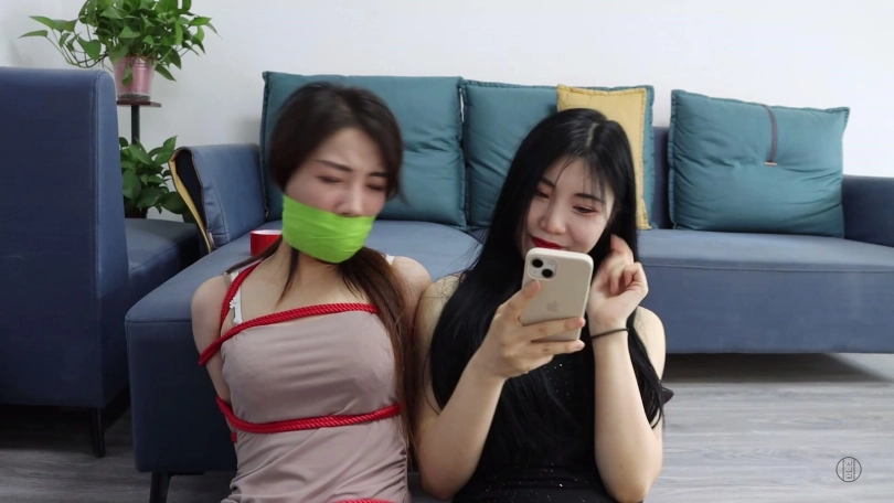 穿着肉色锦纶丝袜的柳洋坐在地上呜呜闷哼挣扎着,吴晗来回挑逗她,到后来干脆坐在柳洋旁边拿柳洋的手机给她拍照,故意二人一起合影后拿给她看进行羞辱,还说要把这些照片发给柳洋的亲朋好友看看。(这一段剧本上要求两个模特自由发挥,两位表演都很精彩)