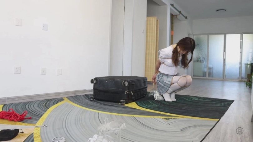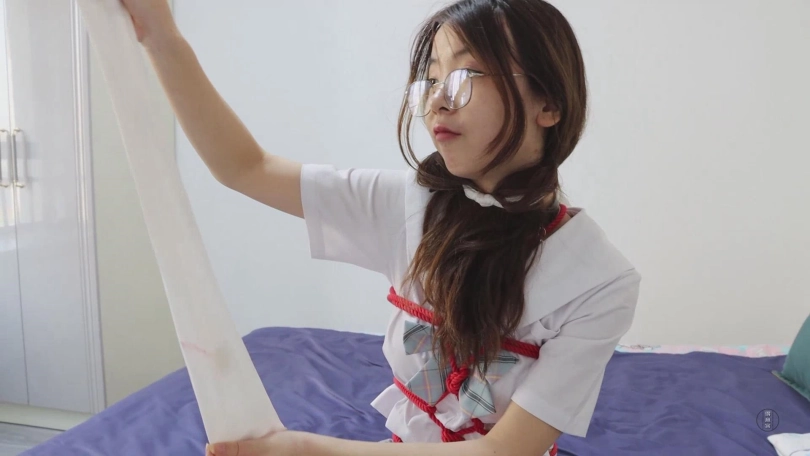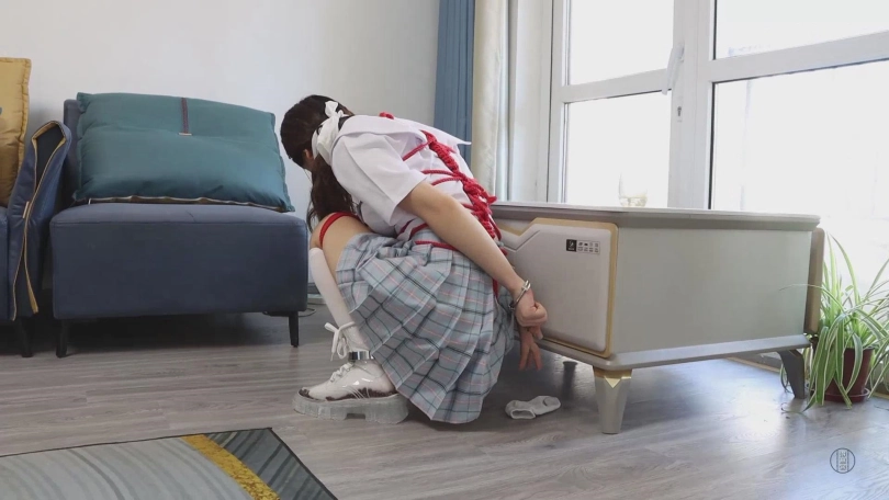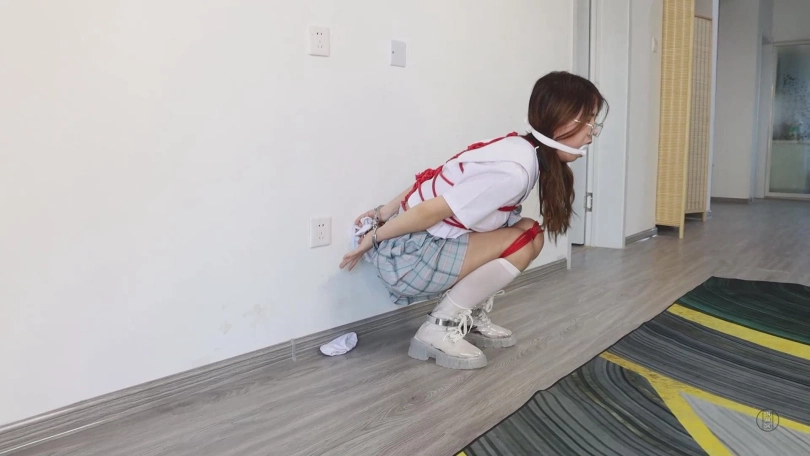 在正式开始自我奴役游戏之前,需要先准备好道具才行,但由于刚才的憋尿挑战失败,小清决定给自己增加难度,以被绑着的状态去准备自我奴役需要的道具。想着,她取出了绳子和一双白色长筒丝袜。