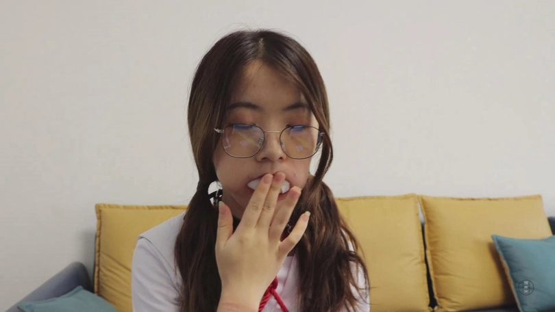 而后,小清将脚上的白色长筒丝袜缓缓脱下,经过了刚才的一番折腾早已被汗微微打湿,这才是清想要的效果,清将一只长筒袜缓缓塞入嘴里,然后用另一条长筒袜打结后勒住,这双刚做好的原味长筒袜将会陪伴她进行下一个游戏。