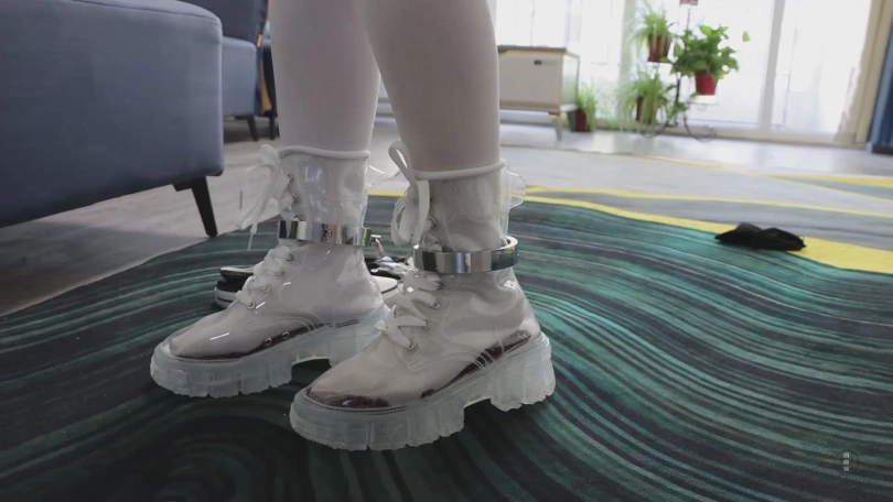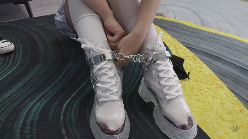 准备妥当后,小清取来那双透明马丁靴,将大量的红豆倒入马丁靴,使之铺满鞋底,这样一来清的小脚便只能踩着这些红豆艰难的挤在马丁靴里,而透明材质的靴子能够清晰的看到小脚被折磨的样子,清将脚塞进靴子后系紧鞋带,然后将脚镣,手铐和拇指铐的钥匙分别塞进三只袜子里,然后将袜子放在三个不同的位置,等下她将会带着浑身的束缚艰难的取回钥匙。