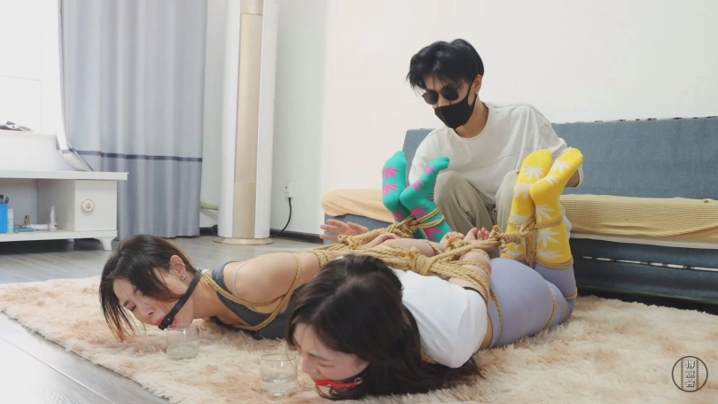 一含被绑成大字形,口球堵嘴,安安从上到下抚摸亲吻一含,把脸埋在胸前,深深的嗅了一口说:“姐姐的味道还是那么让人陶醉啊。我可得好好玩一玩,来,姐姐尝尝我的丝袜味道如何”,脱下自己的黑丝塞入一含的口中。歹徒出现在后面,一含拼命的挣扎想提醒安安。安安:姐姐你就不要反抗了,妹妹我玩够了自然会放过你。安安正陶醉的时候被歹徒从后面打晕,倒在姐姐身上。安安醒来时压在一含身上,和一含绑在一起,二女共同带着连体口球。歹徒玩弄二女的丝袜小脚,接着把二女绑成直臂驷马放在地上,二女带着口球,口水不住的流到下方的杯子里,接着歹徒又脱下二女的原味棉袜塞进了对方的嘴里,二女不断的痛苦挣扎。