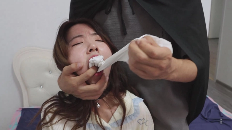 在小清点头表示配合后,神秘人将小清嘴里的白色中筒袜缓缓取出来,并调侃了一句。