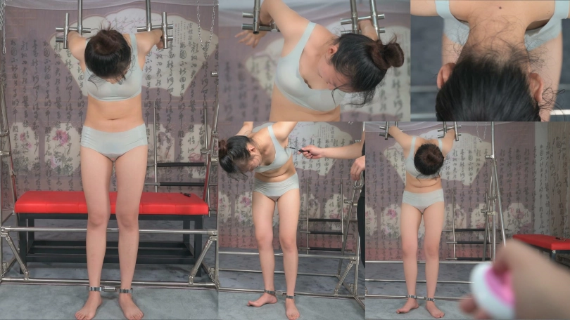 【撒琅制造】高挑美女内衣直臂反扭铁架高吊固定-初试滚刺和震动-这次整得她精疲力尽