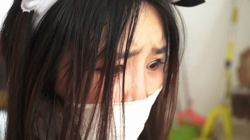 美女玩命的挣扎,但在这夸张的严密捆绑下,她除了像一条肉虫在地上蠕动,其他什么都做不到。