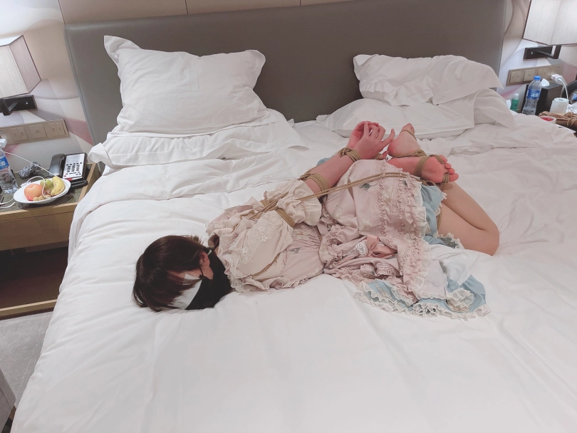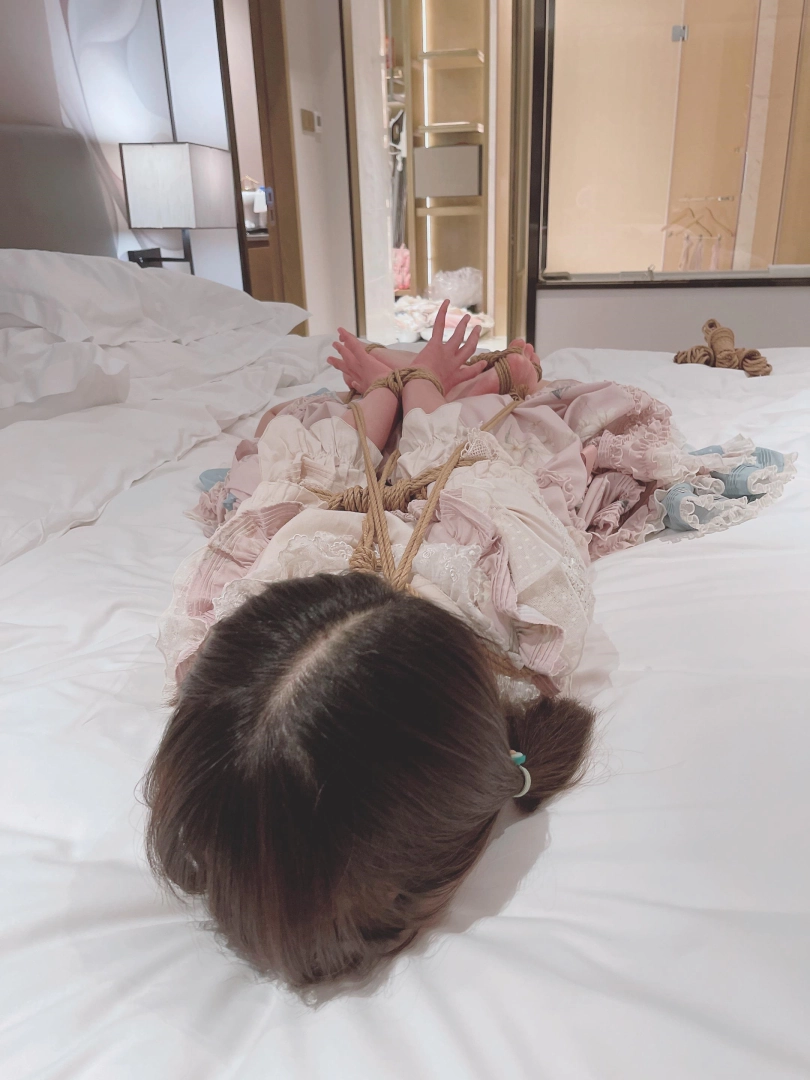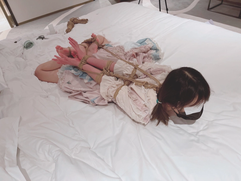 可怜的茶茶双腿几乎熔铸为一个整体,真真切切的体会到了什么叫动弹不得!直臂本就是最难以挣扎的绑法之一,盘腿驷马的支撑能力让茶茶连自己翻身都做不到,更绝望的是这次手指脚趾都被绑起来,此刻的茶茶连动动手指脚趾都成了奢望。一个活泼可爱的少女就这样被绳子连接成了一个整体,真真正正的和物品一样,只能趴在原地挣扎,连一厘米的移动都别想做到了。