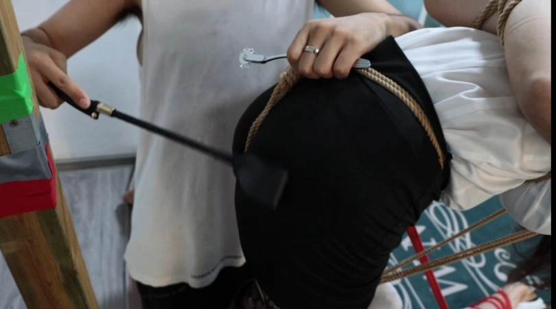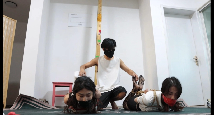 第一幕被弄晕的米娅,一涵二人,随着镜头一转,米娅已换上了牛仔裤,百色紧身背心,帆布鞋,白色条纹袜子,被红色的绳子欧式直臂缚驷马捆绑在地上,男坏人正将一块厚厚的白色毛巾塞入她的嘴巴里,米娅呜呜抗拒,毛巾将她嘴巴塞满后,坏人又给她带上红色口球,在脑后系紧。捆绑堵嘴完米娅后,镜头来到一涵,此时她被日式紧缚吊在柱子边上,穿着OL黑蕾丝袜加上黑色靴子很有气质。男坏人将一双白袜子塞入她的嘴巴,然后用透明胶带将嘴巴封上。捆绑堵嘴二人后,男坏人开始对二女进行玩弄,用齿轮TK,马鞭抽打,拍打屁股,摸胸摸脸十分快活。二女呜呜呜并挣扎!一会,男坏人玩弄,决定将二女严厉捆绑,驷马放置,再严厉堵嘴,于是摁住一涵挣扎的双腿,将她黑色长靴子脱掉后,将她摁倒在地上,紧紧驷马捆绑起来,然后将内裤塞入她的嘴巴里,外面用银色胶带封上,再封上红色胶带,严厉堵好嘴巴。而米娅则被一双粉白色麻叶袜子塞入嘴里,让她的腮帮子鼓起来,接着男坏人用绷带缠绕住她的嘴巴,再用黑色胶带缠绕,将二女驷马捆绑结实,严厉堵嘴后,男子离开,留二女在原地挣扎并呜呜呜。
