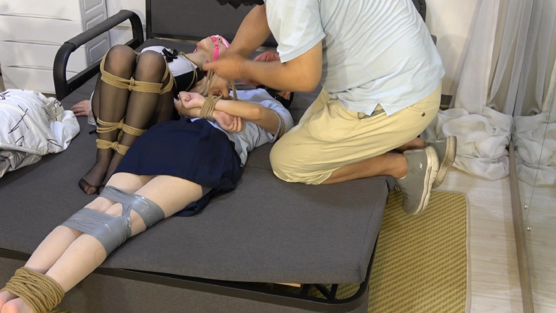 珊珊下班回家,看见床上室友小狐狸盖着被子已经睡了。于是坐到床上,脱下自己穿的黑色高跟鞋,放在小狐狸鞋的旁边,也打算休息了,却发现小狐狸对她相视一笑。珊珊一掀开被子发现小狐狸全身被捆绑,上身绑了精美的龟甲缚,双手绑在背后,一双美腿被许多绳子紧紧绑在一起。原来是小狐狸为了给珊珊庆祝生日而把自己绑成了一件礼物。兴奋的珊珊玩弄了小狐狸一番,拿出道具将自己也绑了起来,准备和小狐狸享受一个甜蜜的夜晚。然而一位不速之客却闯入房间。被绑的珊珊和小狐狸无法反抗,只能任由他加固二人身上的捆绑,嘴巴带上双人口塞,脸对着脸绑在一起......
