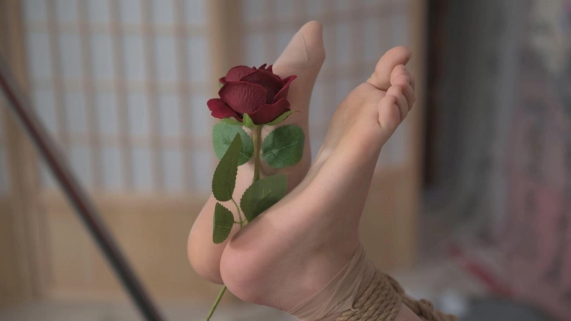 情人节设计的游戏,妹子穿了短裙丝袜和高跟,让她趴在凳子上,木枷固定头和双手,双脚翻折用绳子捆得牢牢地,用玫瑰花杆TK特别应景,妹子不断扭动身体却无能为力。