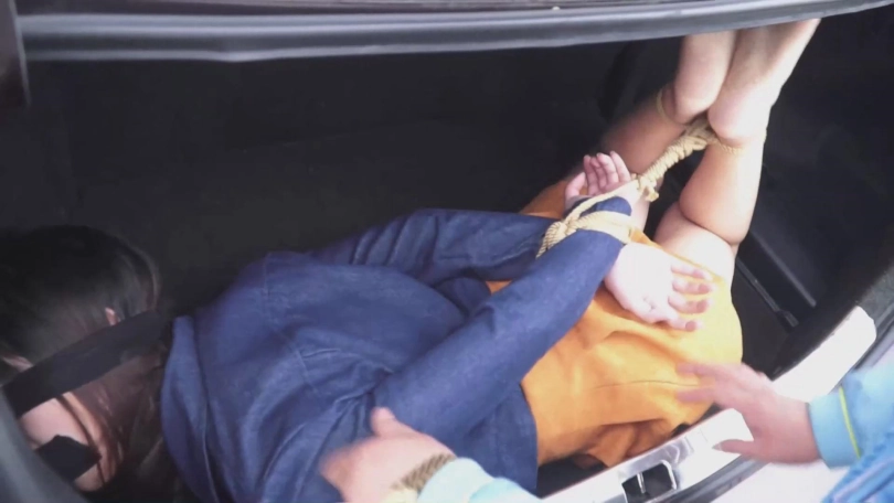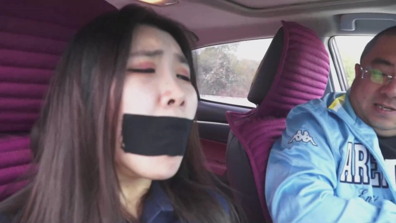接着小张就被男子抱进了后备箱,然后男子又把小张捆成了驷马的姿势,这样小张只能在后备箱微微的挣扎和