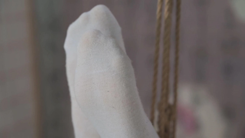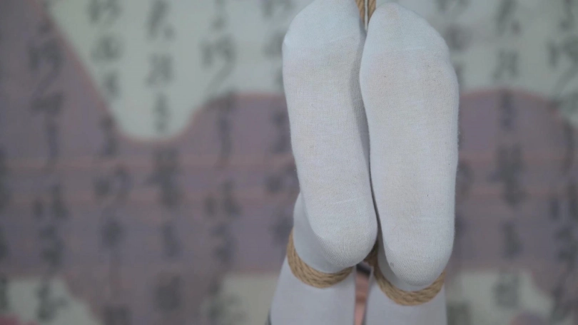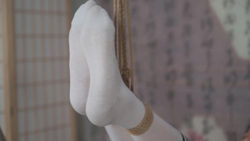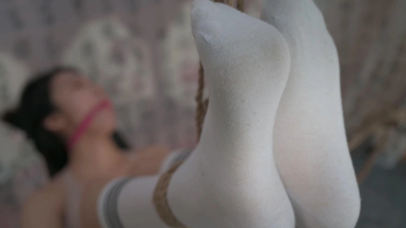 妹子在健身椅上,双腿被高高吊起,双手抱腿呈委屈姿势,这个姿势更利于TK她的大腿内侧等,反应还是很强烈的,当然反应最强烈的还是她的腋下,股绳深深固定,更让她无处可逃。