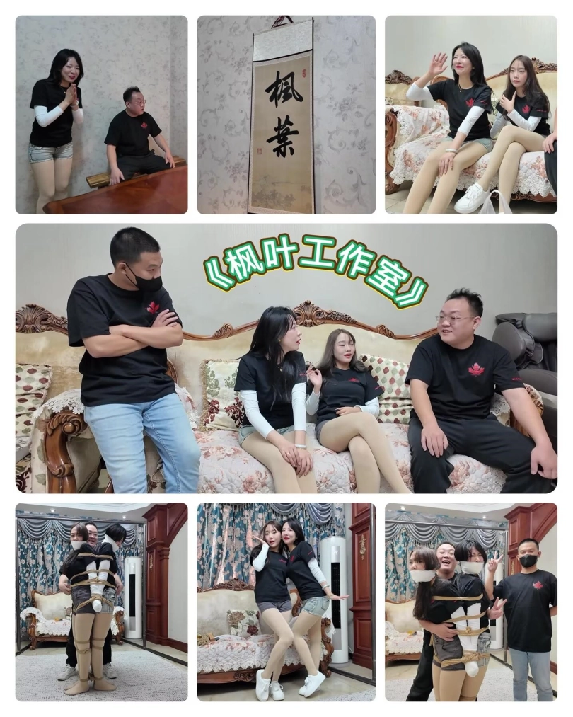 7. 你们在枫叶工作室工作了一段时间,可否分享有什么开心的地方?访问过后,工作人员表示希望米粒和佳雯可以替工作室即兴拍一些照片和宣传视频,她们也配合工作人员摆出不同的姿势。当米粒和佳雯还在专注于拍照时,工作人员突然把她们俩给控制住,表示要拍摄工作室的宣传片,把俩人以新研究的捆绑方式强迫捆绑在一起,更堵上了她们的嘴巴。为了使宣传片更具戏剧性,工作人员为她们绑了一条共同股绳磨擦裆部。在互相拉扯之下,米粒和佳雯被逼以呻吟声来替枫叶工作室拍摄宣传。