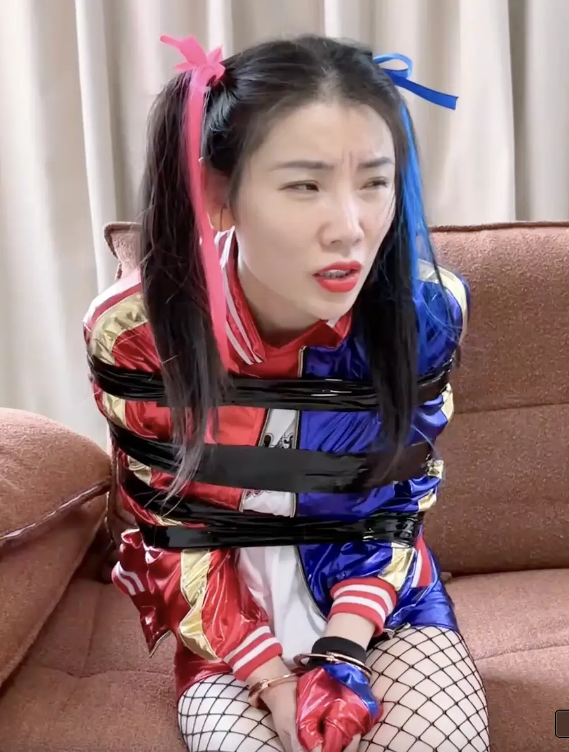 黑化的萝宾·奎因落入了老熟人蝙蝠侠手里,后者陷入两难处境:既要控制住小丑女不让她继续作恶,又不愿下重手伤到往日的伙伴,而狡诈又疯狂的小丑女只想抓住一切机会反杀——23分钟里有5次反转机会!纠结的蝙蝠侠终于用黑胶带+驷马结+长条口塞控制住了小丑女,只是不知能量棒注入的蝙蝠能量又能否驱散小丑的负能量呢……上部的飒爽女侠还是柳洋(一含)的常规角色,下部的疯批美女则完全演high,完美演绎手铐勒脖、蒙眼踢裆、张嘴咬人、妩媚色诱等绝技,而沉稳的缚手小哥也很适合这集蝙蝠侠的矛盾状态。唯一的遗憾是我没买到合适的白色假发ORZ
