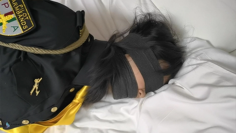 绑法:后⾼⼿,腿被膝盖上下、脚腕三处绳⼦并排绑,胶布蒙眼堵嘴