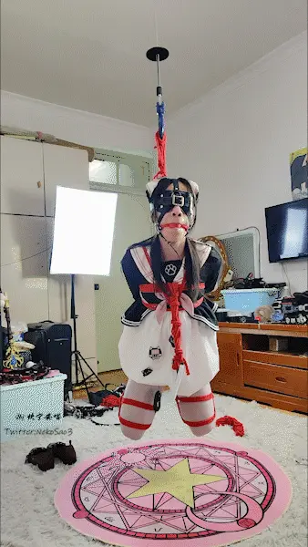 继续自缚~依旧是熟悉的胯吊+上身吊+后手直臂,腿部选用了折腿,然后用绳子拉住马具口球强迫抬头,服装换成了lolita+白丝裤袜