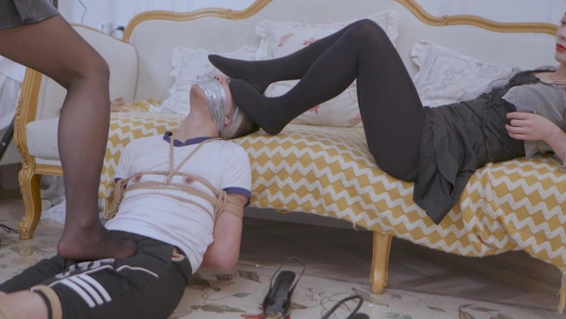 虐的差不多了后,女老板又打晕了小王,把小王媳妇解开,问,他这这么虐你,你生气不?想报仇不?小王媳妇点点头。然后二女就把小王绑了起来还蒙上了眼封住了嘴,虐了一番,虐的小王嗷嗷叫。还嫌不过瘾,又把小王全包了起来,继续虐。最后女老板趁小王媳妇没注意,又把她也打晕了......