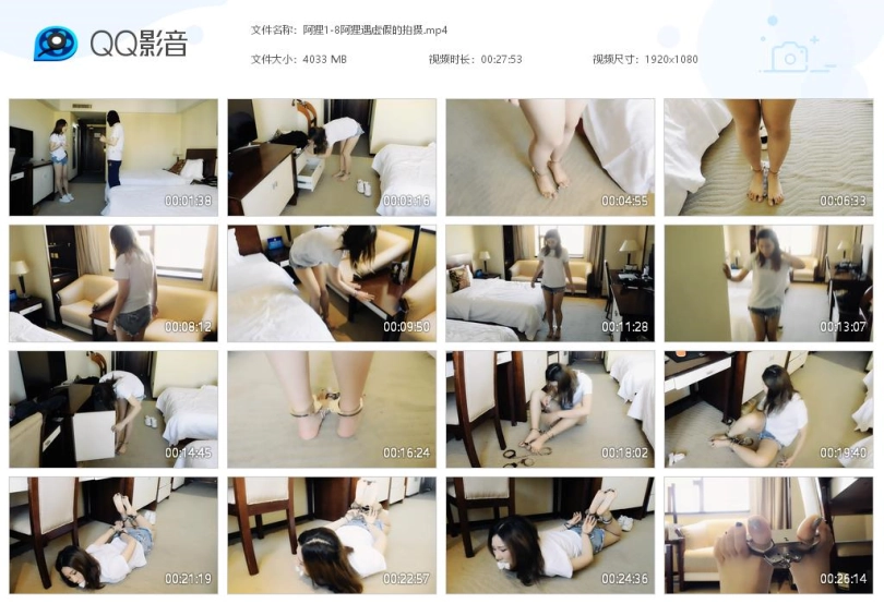 小偷在家中行窃时,遇到保姆妹子回来。妹子看到小偷,十分惊讶,而小偷却谎称他们在拍一个微电影。经过小偷一番精心哄骗,妹子觉得挺好玩的,决定参与。拍摄内容内容是寻找镣铐,找到一个就锁在身上,最后摆出一个漂亮的造型。妹子找镣铐,先找到一把脚铐,锁在脚腕上。然后找到一个链子脚趾铐,脱下鞋袜,锁在脚趾上。妹子慢慢行走,找到一个脚趾铐,锁在了脚上。妹子最后找到一个三通、手铐、长脚镣,决定玩个刺激的,在地板上驷马镣铐。袜子堵嘴,鞋放在头边上。趴在地板上,长脚镣拴住一只脚,手铐锁住手,三通锁上脚和连接手。妹子很享受整个过程,很开心。这时,小偷原形毕露,带走了偷来的东西,并且把保姆扔在地上,自己逃跑了。妹子这时才觉得上当了,却怎么挣扎也弄不开,着急了,要哭了。
