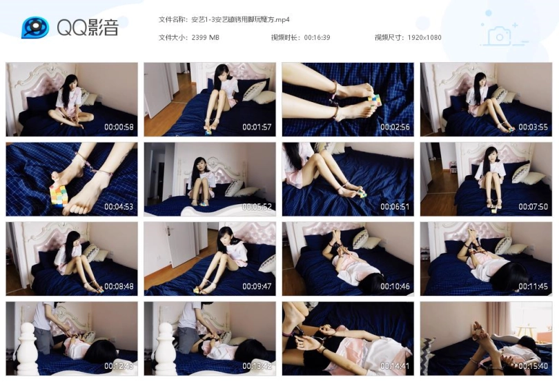 第二个挑战是在10分钟内至少弄对一面魔方,带着脚铐,只能用脚来。先给妹子戴上背铐、脚铐,开始挑战。觉得难度不够,给妹子加上脚趾铐,继续挑战。妹子挑战失败,被哥哥惩罚,驷马镣铐。哥哥挠脚心惩罚。最后哥哥把钥匙留给妹子,自己走了。妹子解开的过程中,钥匙掉了,很绝望。