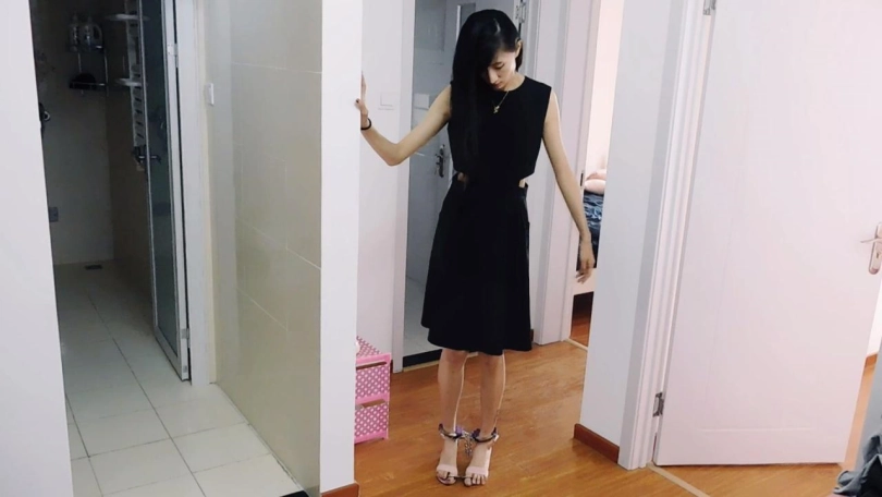 妹子穿着高跟鞋回家,先戴着脚镣,展示、行走。妹子再戴上脚铐、链子脚趾铐,展示、行走。妹子带上手铐,展示。