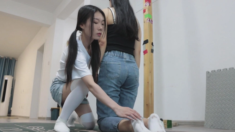 言归正传,这次双人本选用的是绮梦搭配青岚的反差组合,娇小、衣着偏可爱但性格强势的姐姐绮梦与高挑、衣着性感但性格弱气的妹妹青岚,这种对我来说处处充满反差的组合十分戳我的xp,我也热衷于塑造这种反差感十足的角色,毕竟常规一旦发生反转那么爆点也就应运而生,嘛~虽然很可惜内衣部分要在下一集出现,但这一集也不会让你们失望,这个姿势也是一个创新,青岚立棍垫脚站立,站在指压板上受苦,然而股绳却被前方驷马的绮梦牵拉着,绮梦需要向前去触碰青岚的鞋子,但越是挣扎就越会刺激到青岚的股绳,当然还有绮梦自己的股绳,而让堵嘴者指挥,让蒙眼者行动也是个比较恶趣味的小障碍,当然,开胃小菜罢了,让各位白棉同好先解解渴。