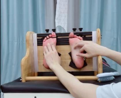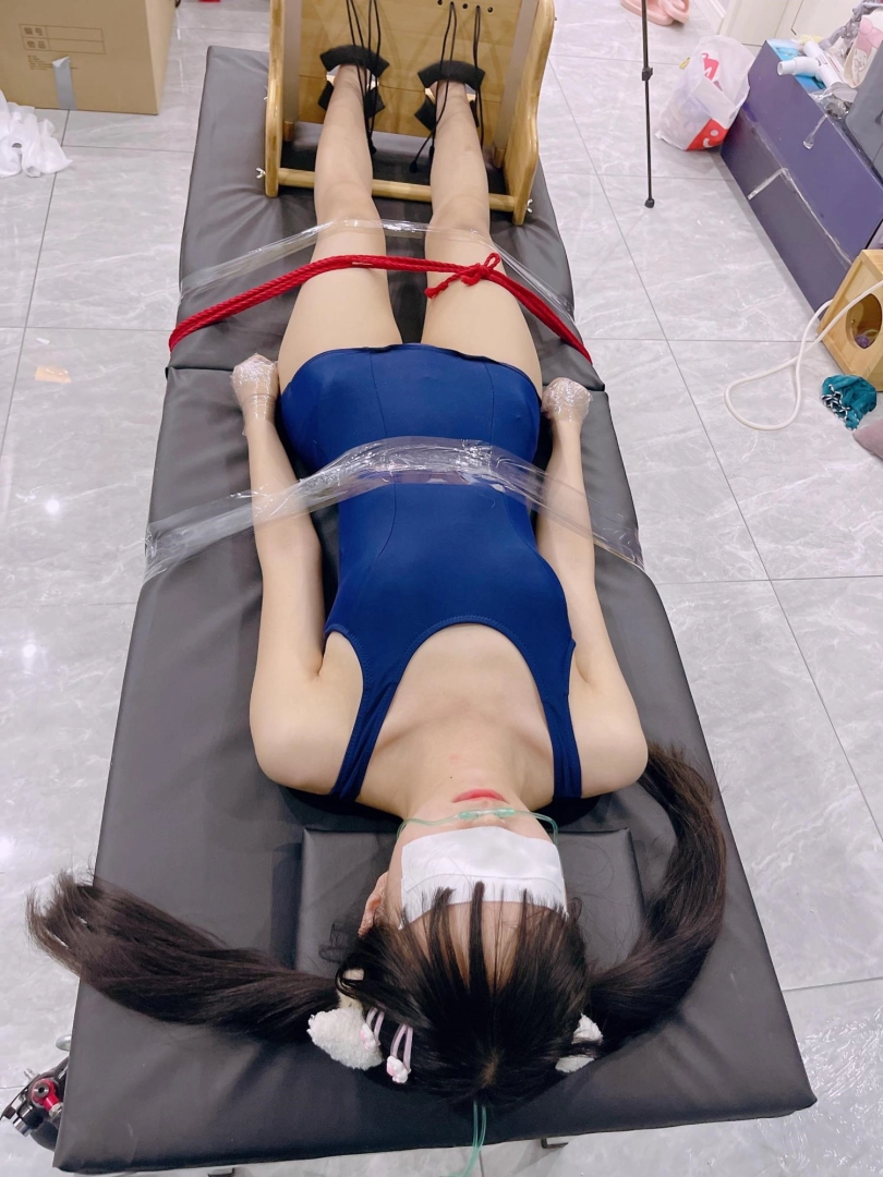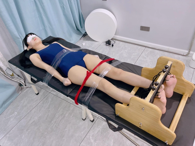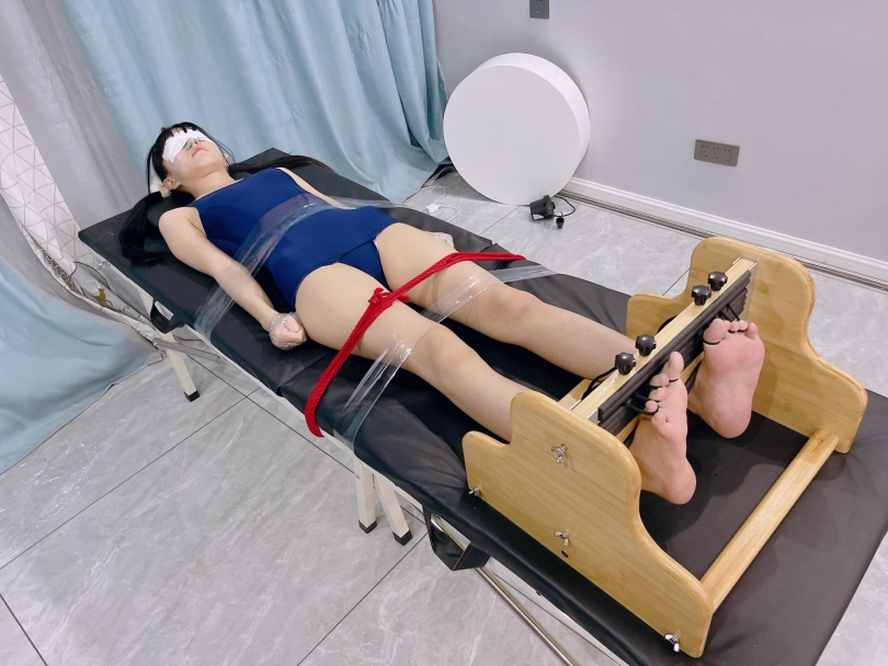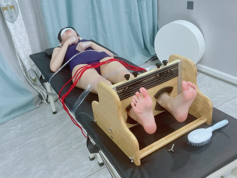 这次把茶茶的手用缠绕膜握拳缠绕后固定在痒刑床上,双脚也固定在足枷上,脚趾也绑好。这样,脚心的嫩肉就完全暴露了。