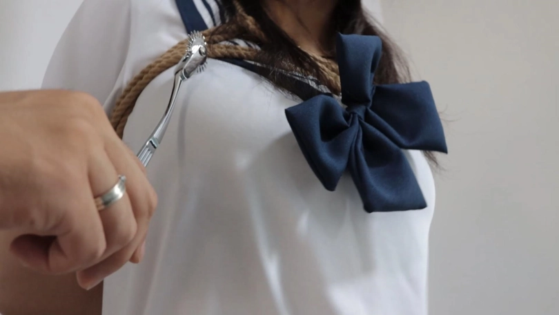 由于束缚太紧并且两眼抹黑,恩可挣扎许久仍未能脱缚,而此时快递小哥骂骂咧咧地回来了,原来是恩可给的是假密码,发现自己被耍的快递小哥十分生气,决定好好惩罚一下恩可,于是再度用迷药迷晕恩可,将恩可吊缚起来。恩可整个人被单腿吊缚,上半身背剪五花,绳子勒住胸部和[X_X]。整个身体的重量都落到着地的那只脚上,恩可只能被迫垫脚苦苦支撑。此外快递小哥还拿刺轮在恩可的胸部以及[X_X]等私密位置不断游走,利用刺轮不断摩擦恩可吊起来的丝足,不断刺激着恩可。