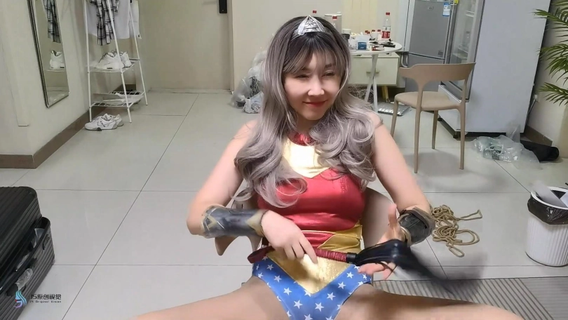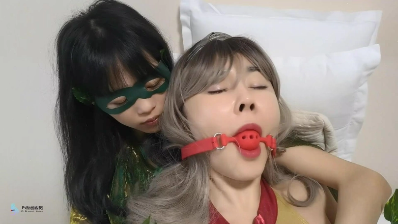 神奇女侠用被两人折磨的不断呻吟。就在对方不注意的时候,女侠拿起掉落的药瓶喷向两人,女侠解开绳子,看着面前睡去的两人,露出了邪恶的笑容。
