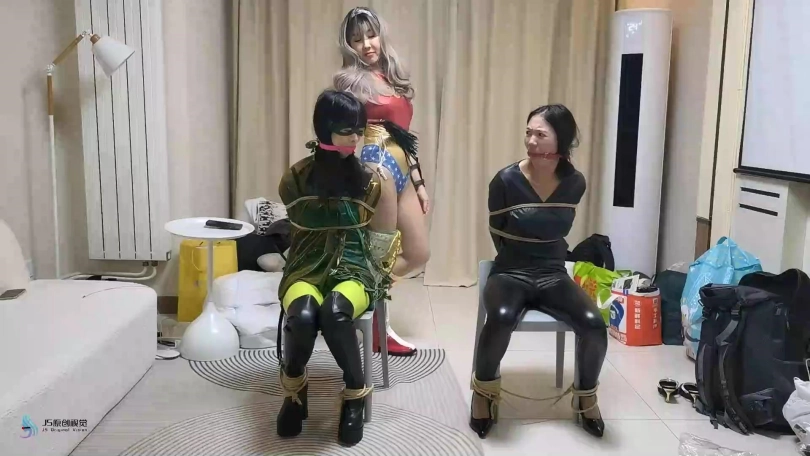 当画面再次亮起时,毒腾女和黑魔女被绑在椅子上,她们的嘴里被塞着口球。她们不断的在椅子上挣扎。这时女侠走了过来,不断的嘲笑着她们,用鞭子抽打着她们。并不断的抚摸她们的敏感地带挑逗着。女侠搬过来一把椅子坐在她们面前。她脱去自己的靴子,用丝袜脚不断的在她们的身上脸上游走。最后用脚不断的按摩她们的[X_X],看着两人被刺激的不断的发出享受的呻吟声,神奇女侠露出了得意的微笑,从此神奇女侠也逆变成一名S女王。