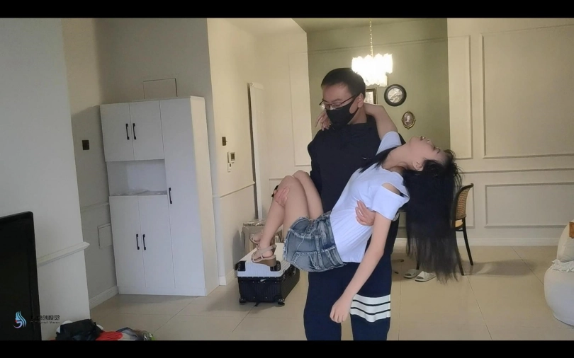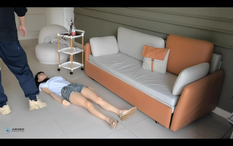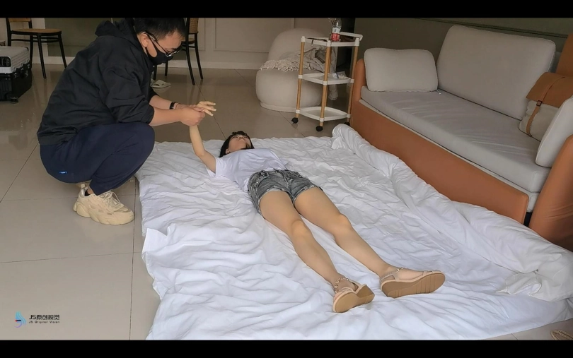 男主开门,扛着昏迷的妹子进屋,把她放在沙发上,不断摇晃她的手和身体,试图叫醒女主,女主还是昏迷不醒。男主没辙,就把女主放在地上躺着,让她双手放在身体两侧,然后离开镜头。